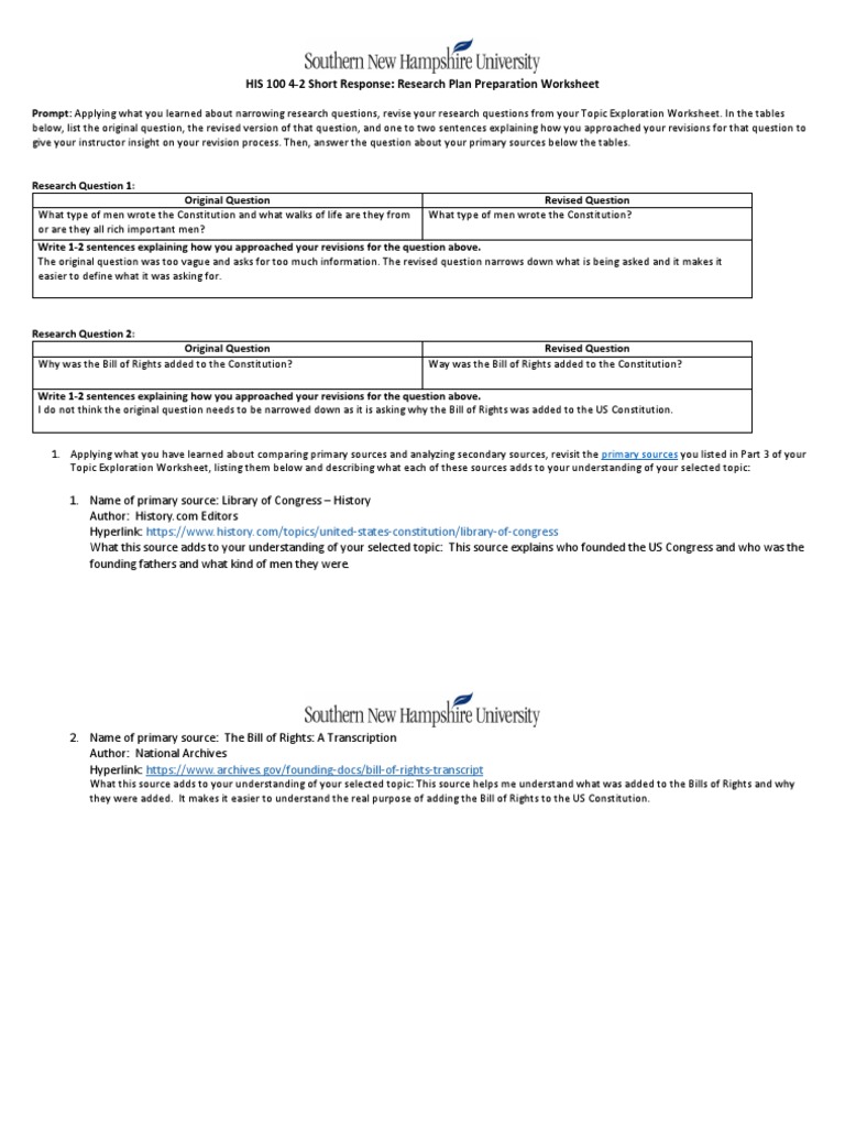 His 100 4 2 Short Response Research Plan Preparation Worksheet Pdf Question United States Bill Of Rights